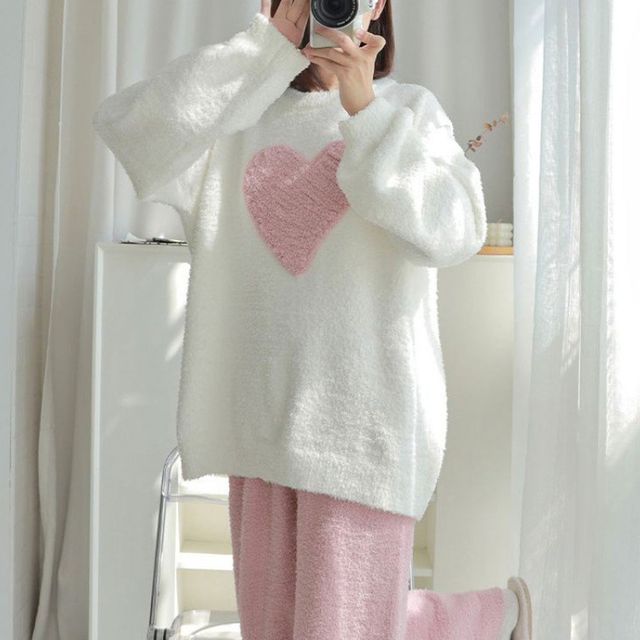 하트 포인트 여성 보송 퍼 잠옷 세트 겨울 수면잠옷