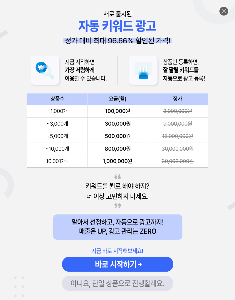 '상품명' 또는 '상품 키워드'에 있는 [띄어쓰기 포함] 완벽하게 일치하는 단어로 신청 주셔야 원활한 노출이 가능합니다.